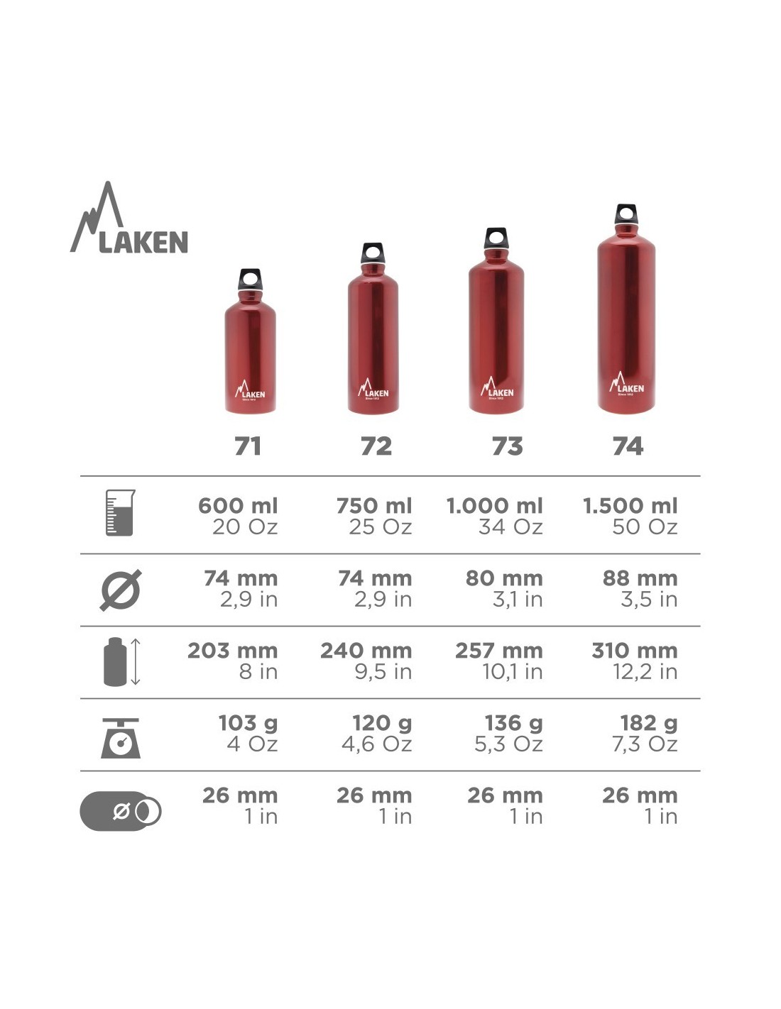 • 0.75L: Diameter: 7.4cm. Height: 24cm. Weight: 120gr