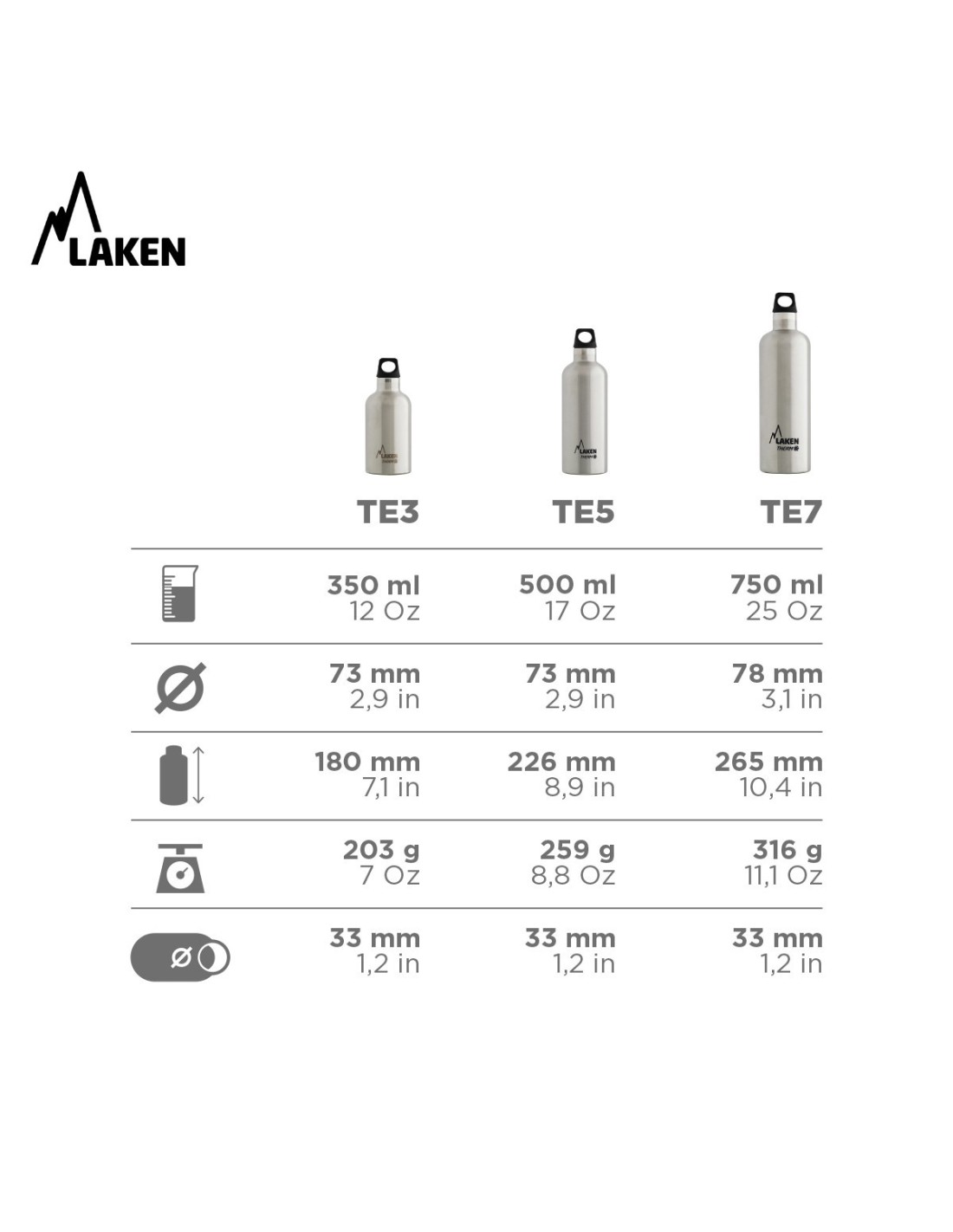 • 0.75L: Diameter: 7.8cm. Height: 26.5cm. Weight: 316gr