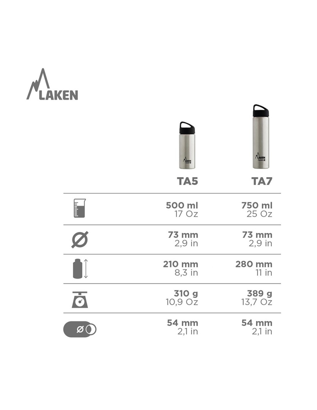 • 0.75L: Diameter: 7.3cm. Height: 28cm. Weight: 372gr