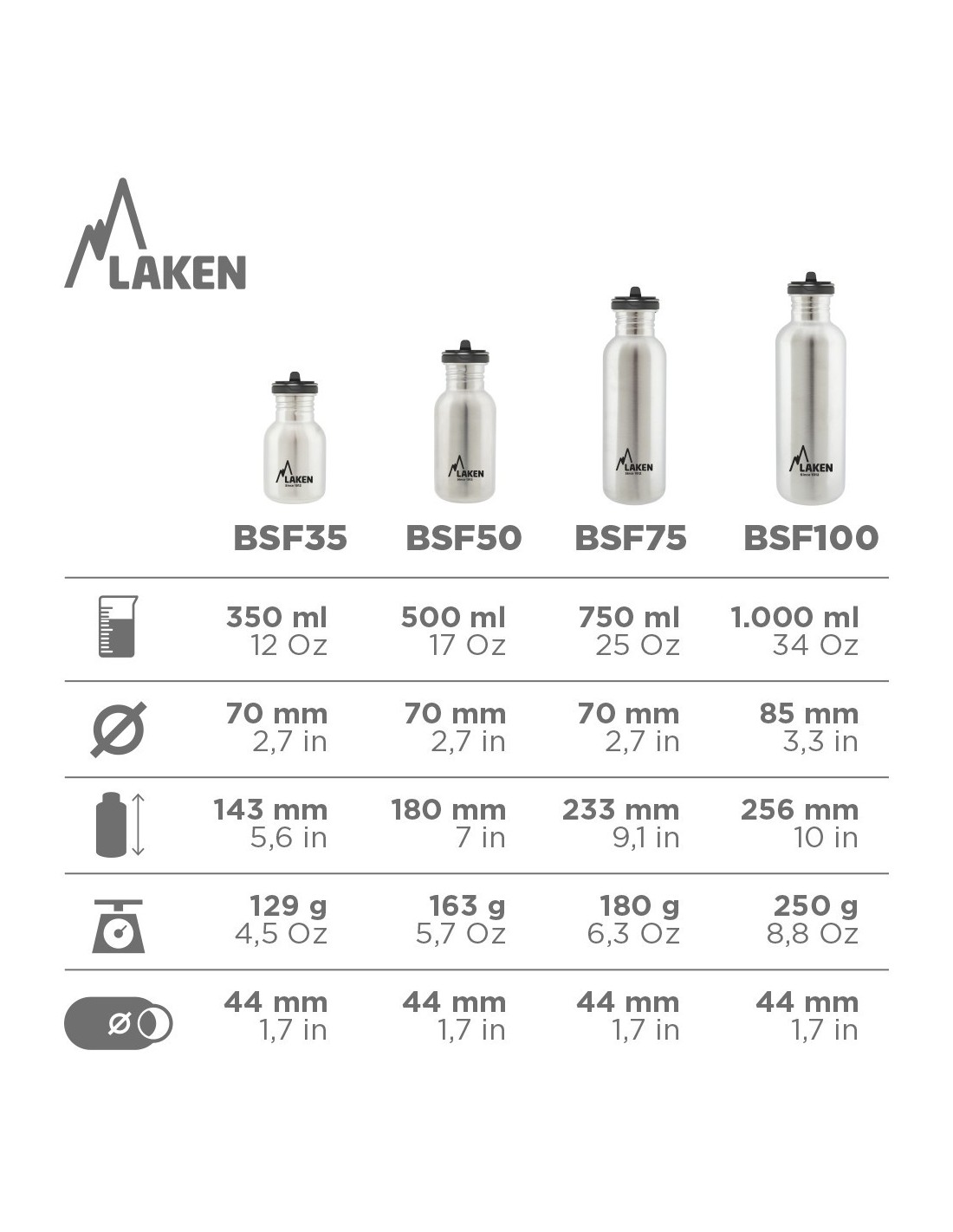 Las botellas Basic Steel Laken son botellas de acero inoxidable 18/8 de una sola pared (no térmicas). Son botellas muy resistentes a la vez que ligeras, con cierre hermético, completamente seguras y con unas líneas muy bonitas, que las convierten en la opción preferida por gran parte de nuestros clientes para el día a día.