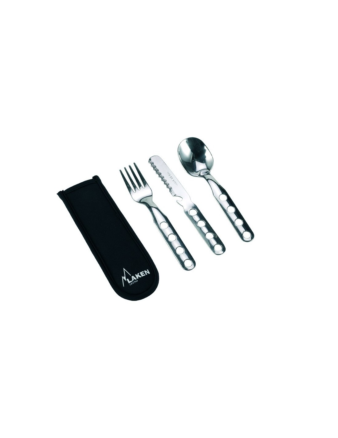 Cuchillo, cuchara y tenedor de acero inoxidable, muy ligeros, de tamaño ideal y con funda de neopreno para guardar el set.